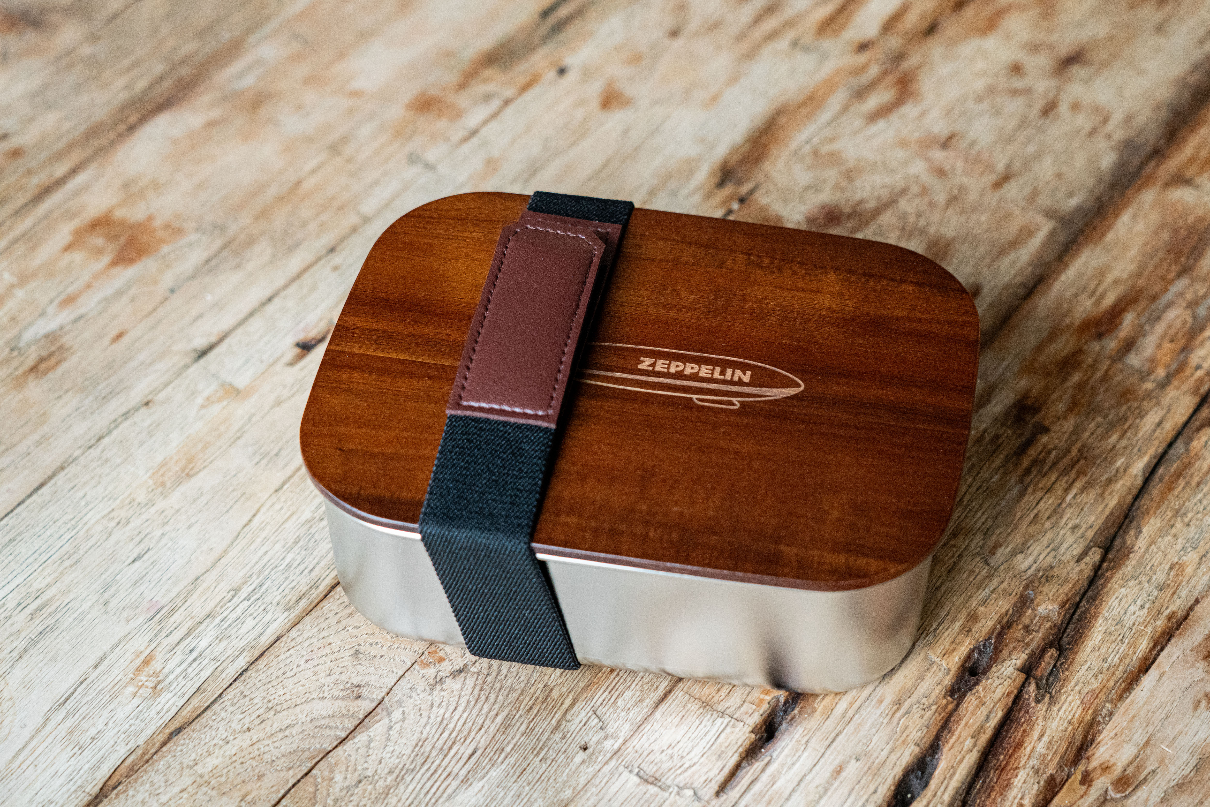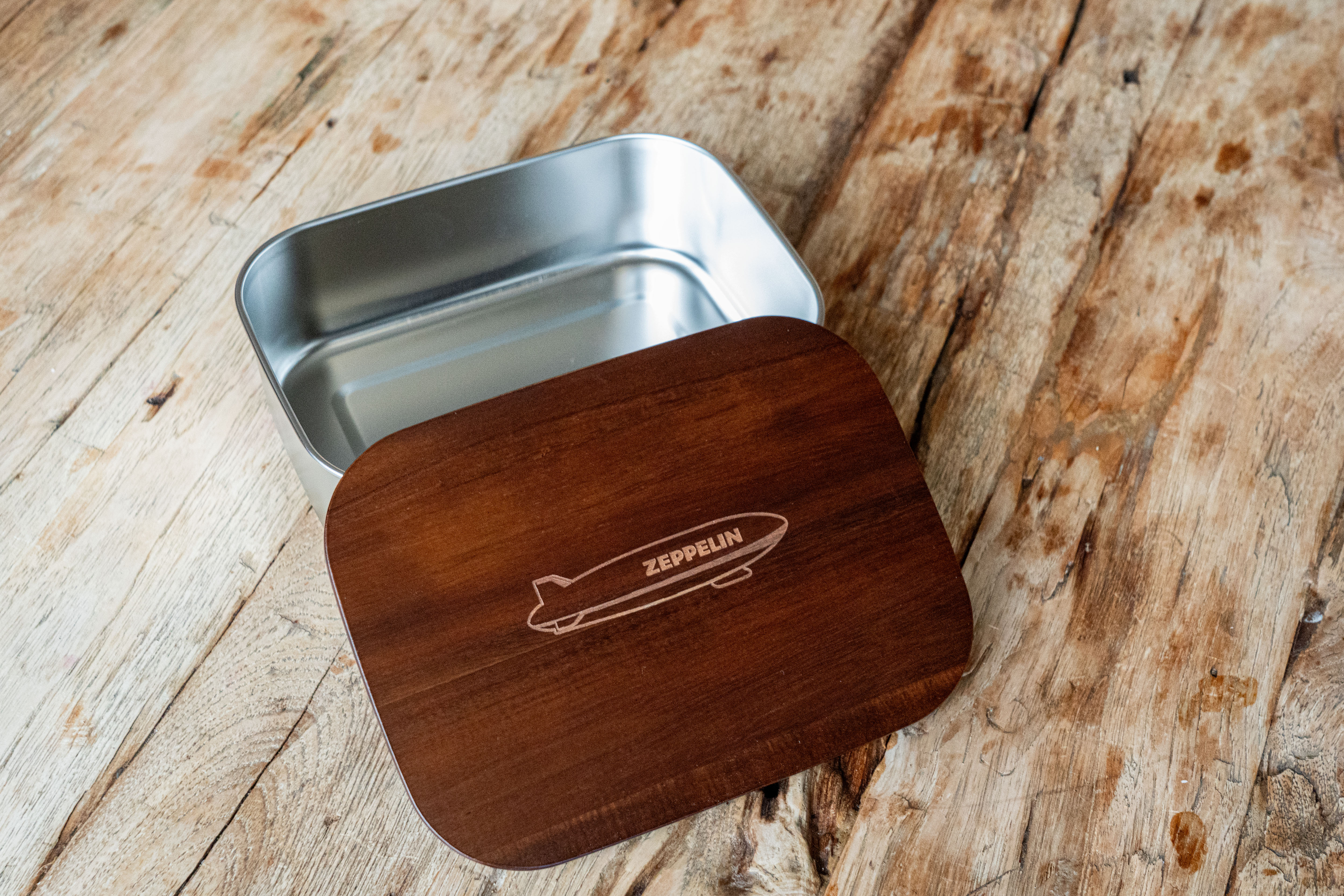 Der auffallend schöne Deckel aus robustem Akazienholz mit unserem beliebten Zeppelin Shape verleiht der Lunchbox eine warme, natürliche Ausstrahlung.